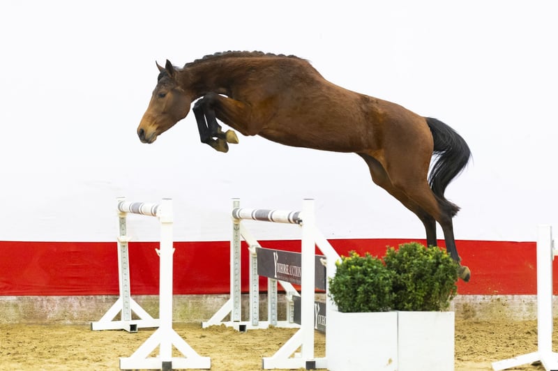Beautiful 3-year-old mare with a modern type and plenty of blood. She already jumps with confidence and shows that she understands her job. She is light-footed, quick off the ground and demonstrates a very good jumping technique. Her take-off is fast and efficient, and she stays well balanced over the fence. She finishes the jump with ease. In movement she is light and easy to ride. The engine is always on. A true blood-type sporthorse with energy and mindset.