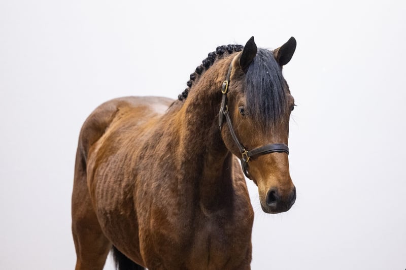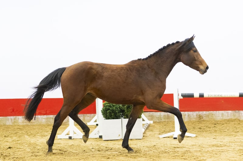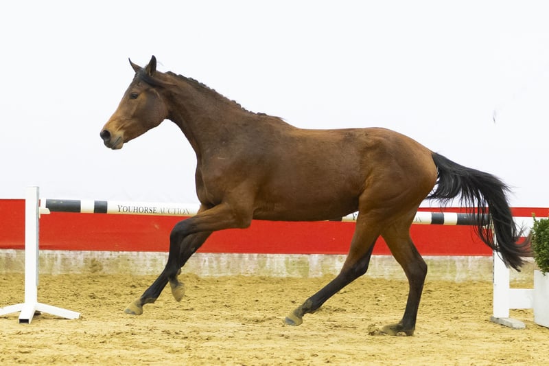 Beautiful 3-year-old mare with a modern type and plenty of blood. She already jumps with confidence and shows that she understands her job. She is light-footed, quick off the ground and demonstrates a very good jumping technique. Her take-off is fast and efficient, and she stays well balanced over the fence. She finishes the jump with ease. In movement she is light and easy to ride. The engine is always on. A true blood-type sporthorse with energy and mindset.