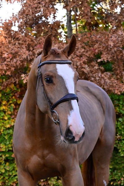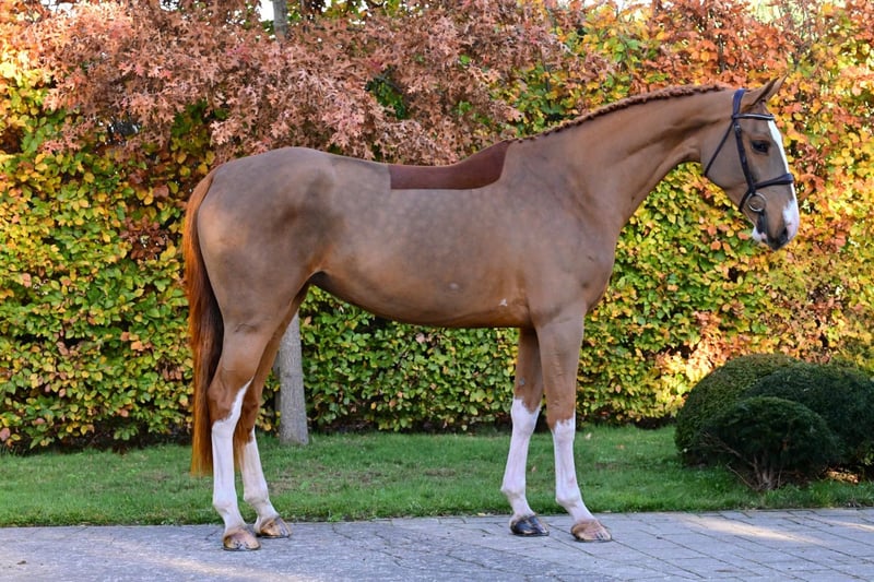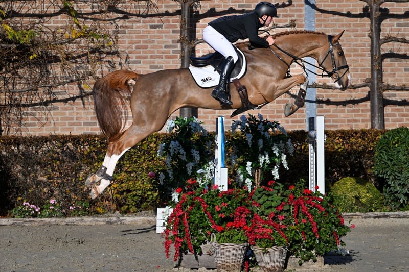 Hera ter Wilgen is a beautifully marked five-year-old chestnut mare with an elegant rectangular model. Her sire Heartbeat, himself a son of Heartbreaker, is known for passing on carefulness to his offspring—something clearly visible in Hera. She has a correct trot and a very active, ground-covering canter. On the dam’s side, we find a remarkably strong mare line featuring influential stallions such as Air Jordan Z and Guidam, with Nikita van Spieveld as the foundation mare—a true cornerstone of a successful dynasty. This family has produced several notable sport horses, including her half-sister Bellissima ter Wilgen (1m50) ridden by, among others, Lorenzo de Luca; Smash van de Plantaan (1m60); and Heliante ter Wilgen (1m50) with Hector Florentino. Hera ter Wilgen is already very easy to ride and work with for her age. She is willing, uncomplicated, and shows a naturally correct way of going. What stands out most is her scope and the effortless way she navigates the course. For riders seeking a reliable partner with real potential and the right mindset, Hera ter Wilgen is a highly recommended choice. In the case of direct export to non-EU countries, VAT is no longer applicable (21% becomes 0%). If the export is delayed (but happens as soon as possible), the VAT will be refunded after we have received the official export document (which is drawn up by customs).