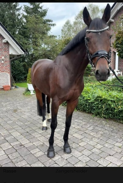Elegant Zangersheider Mare for Sale – Perfect for Show Jumping! This beautiful dark bay mare, born in 2016, impresses with her striking appearance and natural talent for jumping. She is also very well-behaved and affectionate, yet has plenty of go under the saddle and clears everything effortlessly. With a height of 16.1 hh, she offers the ideal size for ambitious riders seeking a reliable partner in the show jumping arena. She comes from a renowned Zangersheider breeding program and boasts a promising pedigree. Her agility, liveliness, and eagerness to learn make her an excellent partner for competitive riding or dedicated leisure riding. Please feel free to contact me for more information or if you are interested. Come and see this exceptional mare for yourself!