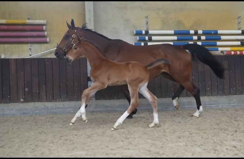 Emerytt du VS z is an Emerald van't Ruytershof x Bamako de Muze x Regilio The stallion has been handled since day one and is well-behaved. He stands still for the farrier, easily loads the trailer, and his vaccinations have always been kept up to date. Emerytt has always been kept in a group and is familiar with other horses. The dam, Belvu van Waerbeek z, daughter of Wikske II van Wittenberg (1.45m), is the half-sister of Trixie z (1.60m), Too Wicked SDW z (1.55m), and No Wicked Grin SDW z (1.35m). This promising stallion comes from the mare line of Stal Ceulenmans (Stal de Dwerse Hagen) and from the same mare line as the 1.65m stallion Cento Lano. Emerytt has jumped twice in freedom and is already showing his talents. Interested or want more information? Call or send a message to: +32 473 25 93 26