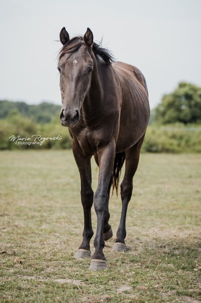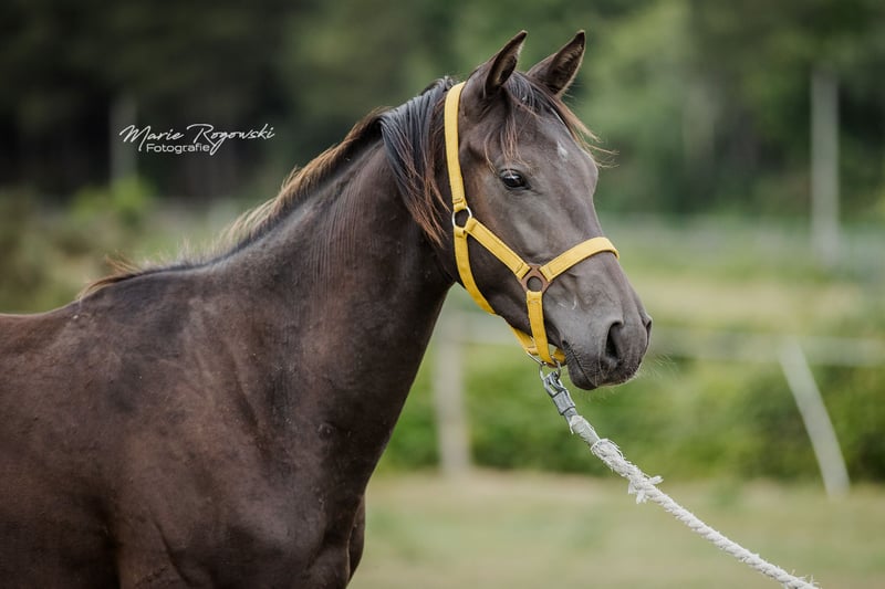 Late-born young stallion (12.09.2022) from color breeding program. Son of the exceptional English thoroughbred in smoky-cream T C F Palladium xx (True Colours Farm Canada) and an equally rare classic champagne warmblood mare (!!!) (ZfDP) by Rapptänzer OLD - Khalvin Khlein KpM (Partbred Arabian special champagne USA). Born in France with Zangersheide passport (main book) and IFCE. Very harmonious, compact young stallion with a simple Créme gene, which he can also pass on. Versatile and versatile. His final height will be around 162-164 cm at the age of six. Now the youngest boy in the group, he is enjoying his youth out in the field rearing big lads, while maintaining daily contact with people and handling them with curiosity and determination at stud. Feeding, grooming, hoof care, leading, ground course and loading (truck transport) are familiar, as are worming and vaccination. Last Smoke goes into careful, nurturing hands, can also stay for another year for needs-based rearing (with an old stallion) and will be trained further.