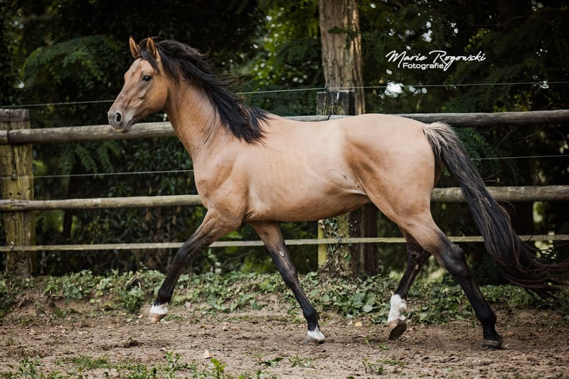 Zangersheide stallion in bay dun | born 2018 | 163 cm Approved stallion for AES, Zangersheide Genetics: E/e A/a D/n Tested free of ECVM, PSSM2, MFM, RER (CAG Panel) Fabelkönig is a stallion with great presence and impeccable behaviour. He was broken in in 2024 and shows enthusiasm and great potential. Since then, he has not been able to be worked on further due to time constraints, but would be ready to start training immediately. Fabelkönig is perhaps the only licensed warmblood stallion that passes on the dun colour. He got his colour from his dam Funny Girl, also a bay dun mare who can be viewed at our stud. Three other offspring from the same dam can also be viewed at our stud. At the renowned Trakehner stud farm in Merzdorf, the licensed Norwegian Fjord horse stallion Emil *1972 covered the English thoroughbred mare Feinsliebchen, who is registered in the main stud book of German Trakehner breeding. The Trakehner Association and later the ZfDP recognised this and the filly qualified for the main stud book. This is Funny Girl's grandmother. This means that Fabelkönig now has foreign blood in the 4th generation and his foals are therefore eligible for registration with many renowned sports associations. Fabelkönig's sire is the Spree stallion Fürst Wilhelm, carrying every big name there is when it comes to dressage lineages, and his sporting career speaks for itself.