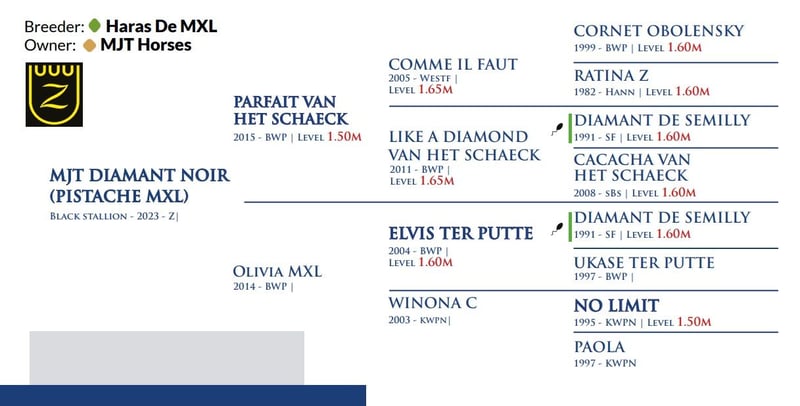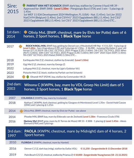 OFERTA STANÓWKI 2026. Posiadamy w naszej ofercie w tym sezonie niesamowicie utalentowane młode ogiery z wybitnych linii żeńskich dające konie GP160. MJT Diamant Noir (Pistache MXL Z). - (Parfait Van Het Schaeck Comme Il Faut) x Elvis ter Putte) - Potencjał skoku i równowaga. Brat najlepszego 8 latka na świecie 2025 roku GP160 wg rankingu Hippomundo. MJT Diamant Noir (Pistache MXL Z) pochodzi z renomowanej rodziny hodowlanej. Matka, Olivia MXL, jest córką ogiera Elvis ter Putte i ogiera No Limit, który jest znany ze swojego wkładu w hodowlę koni skokowych. Parfait van het Schaeck łączy w sobie cechy dwóch wybitnych koni: Comme Il Faut i Like A Diamond van het Schaeck. Już w pierwszym pokoleniu pokazał swój potencjał hodowlany. W 2023 roku dwóch synów zostało uznanych przez BWP: Tattoo H&DB oraz Parfait van het Schaeck. Jego matka, Like A Diamond van het Schaeck, z Marlonem Zanotellim na grzbiecie, odniosła liczne sukcesy w zawodach najwyższej rangi. Zdobyła m.in. zwycięstwo w Grand Prix Global Champions Tour w Paryżu, Queen’s Cup w Barcelonie oraz zajmując czołowe miejsca w Rzymie i Samorin, a także uczestniczyła w Mistrzostwach Świata FEI w Herning. Parfait van het Schaeck pochodzi z wyjątkowego rodowodu, który łączy w sobie najlepsze linie skokowe. Jego ojciec, Comme Il Faut, jest synem legendarnego Cornet Obolensky i dwukrotnej mistrzyni olimpijskiej Ratina Z. Nie można jednak zapomnieć o linii żeńskiej, gdzie znajdziemy klacze na poziomie 160cm. Jego matka Like A Diamond van het Schaeck z Marlonem Zanotellim na grzbiecie, odniosła liczne sukcesy w zawodach najwyższej rangi. Olivia MXL łączy w sobie najlepsze linie skokowe. Jej ojciec, to ogier o międzynarodowej renomie- Elvis ter Putte, który jest synem legendarnego Nabab de Rêve. Matka to klacz Winona C, która wywodzi z linii No Limit. Ponadto Olivia MXL jest matką już dwóch doskonałych sportowców: Rock’n Roll MXL i Earthquake MXL Z. Rock’n Roll MXL to jeden z naszych najlepszych koni, który zakwalifikował się do ścisłego finału w Miatrzostwach Świata w Lanaken w kategorii koni 7-letnich. Aktualnie trenuje pod Sárą Vingrálková na poziomie 160. Cena nasienia to jedyne 990 zł netto + 8% VAT. Jest to cena uprawniająca do krycia jednej klaczy przez sezon hodowlany 2026. Do ceny nasienia należy doliczyć koszty dokumentacji 300 zł netto + 23% VAT , oraz koszt wysyłki. Możliwość opisania źrebięcia w PZHK. Wszystkie materiały potrzebne do podjęcia właściwej decyzji znajdziecie państwo poniżej. +48 885 563 658 Maciej www.mjthorses.com KATALOG https://mjthorses.com/_Resources/Persistent/6/f/5/8/6f58f201ad940192b173390324b1276ad64982cc/M_nowe_2026_PL_katalog.pdf YOUTUBE SKOKI OGIERÓW https://youtube.com/playlist?list=PLqJoGiloQ5UgR_JRg-dZT-zvRRoS74V1i&si=FCYWtkgN7Pt6tWva INSTAGRAM https://www.instagram.com/mjt_horses?igsh=ZTZ3OWRva2FtbHY0&utm_source=qr FACEBOOK https://www.facebook.com/share/1BtNmhwzT1/?mibextid=wwXIfr ZAPRASZAMY DO KONTAKTU!