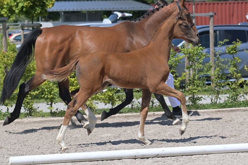 This beautiful and very correctly built dressage mare was born on March 23, 2025. She is an exceptional specimen - long-legged, elegant, chestnut, and with four white socks. She is an embryo transfer foal from the famous Vitalos. Her mother, Quality Time, is 10 years old this year and an Oldenburg elite mare - pedigree: Quantensprung/Placido. Quality Time has been successfully competing in dressage for years and has won all her tests in 2025 so far. M**, S*, and S** victories all with scores of 69-70%. She is currently nearly S*** ready and will make her debut at this level this season. Quality Time was also qualified for the Bundeschampionat as a 5-year-old. With this beautiful and talented filly, you are securing the future! The sale is directly from the breeder. The mother is also with us and can be viewed. !! The mare with which the foal is at foot is not the genetic mother but a surrogate mother. The ridden black mare in the videos/pictures is the genetic mother. Additionally, we are selling a full brother to this foal, born on March 10, 2025.